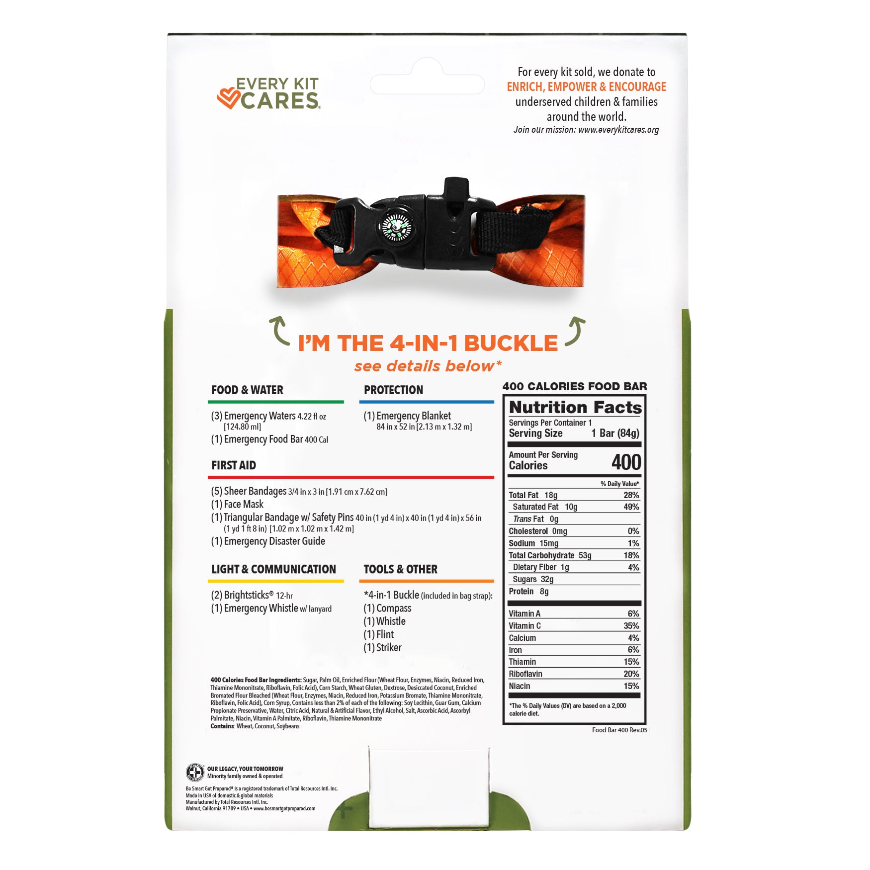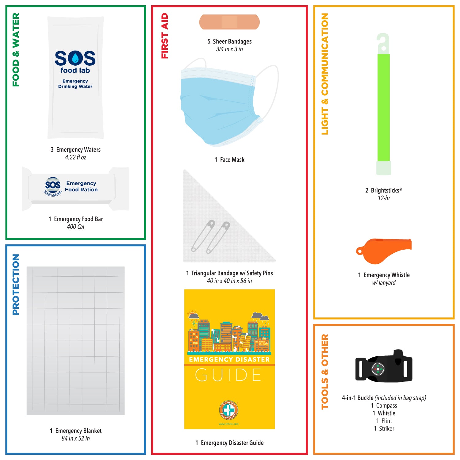 - PILLARS OF EMERGENCY: Contains the 6 major essentials of emergency: Water, Food, First Aid, Protection, Communication, and Light