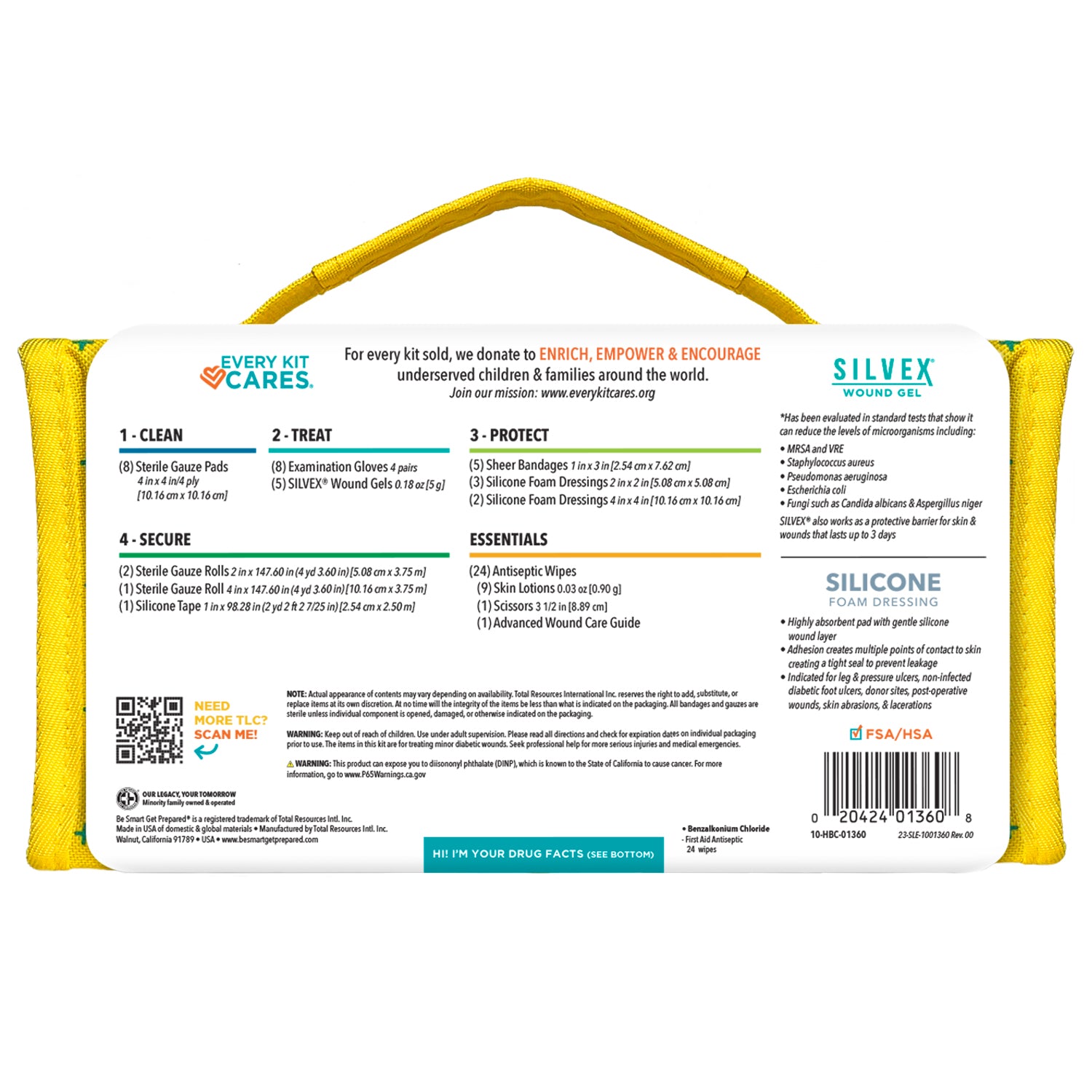 The Be Smart Get Prepared Tender Lovin’, Diabetes-Friendly Wound Care, 70 Pieces provides essential treatments for wound stages 1, 2, and 3. Designed with foldable hook-and-loop fastener strips and organized compartments to keep supplies secure, easy to store and ideal for travel. While diabetic wounds require special care, this advanced wound care kit includes 4 easy steps: Clean, Treat, Protect, and Secure to manage the injury. It comes packed with sterile gauze pads, SILVEX Wound Gels, examination gloves, silicone foam dressings, sterile gauze rolls & pads, silicone tape, antiseptic wipes, scissors, skin lotions, and an advanced wound care guide.